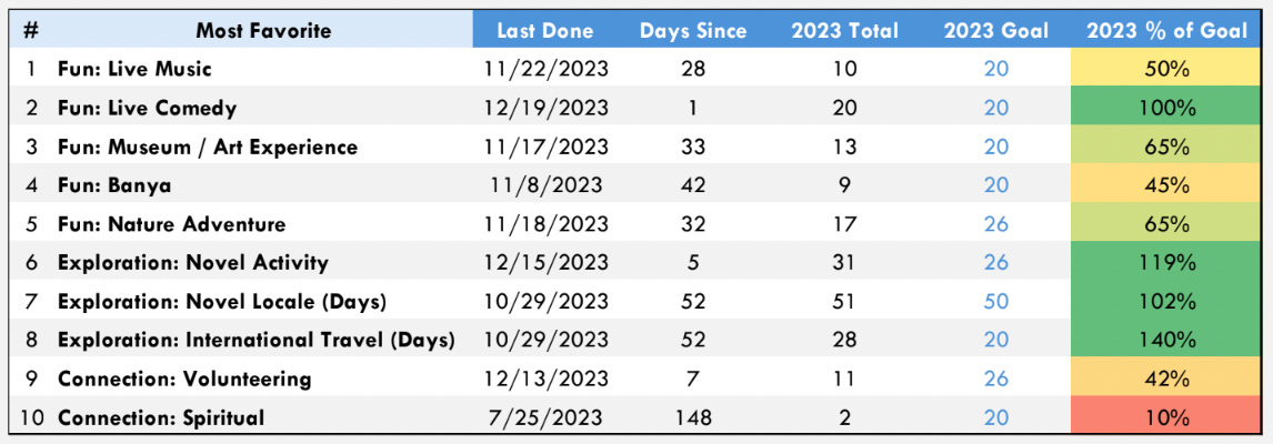 Concerts/Comedy nights/Museums visited: 3 / 2 / 6. Goal? Not specified, but ideally once a month, totalling 36.